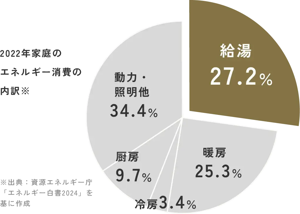 給湯が家庭のエネルギー消費量の4分の1を占めており、いつもの生活で光熱費削減が期待できます。