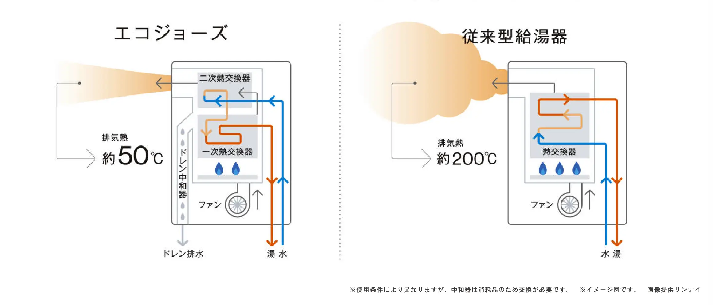 ※エコジョーズの詳細は、リンナイのホームページをご覧ください。(https://rinnai.jp/products/waterheater/)