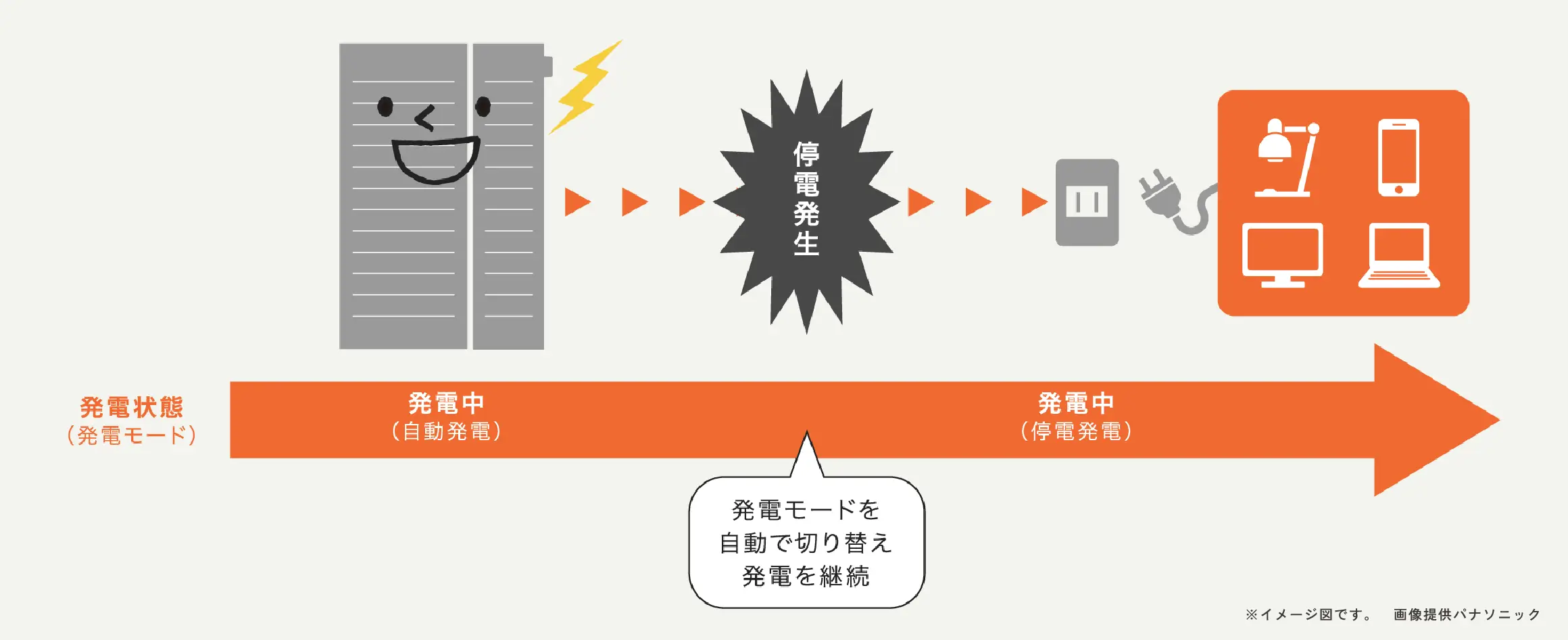 停電時発電継続機能(つづけて発電)が搭載されており、停電が発生したときにエネファームが発電中だった場合、そのまま発電を継続して、停電時でも電気とお湯を供給します。また、ガスが停止した場合は、電気を使ってヒーターでお湯をつくることができます。
